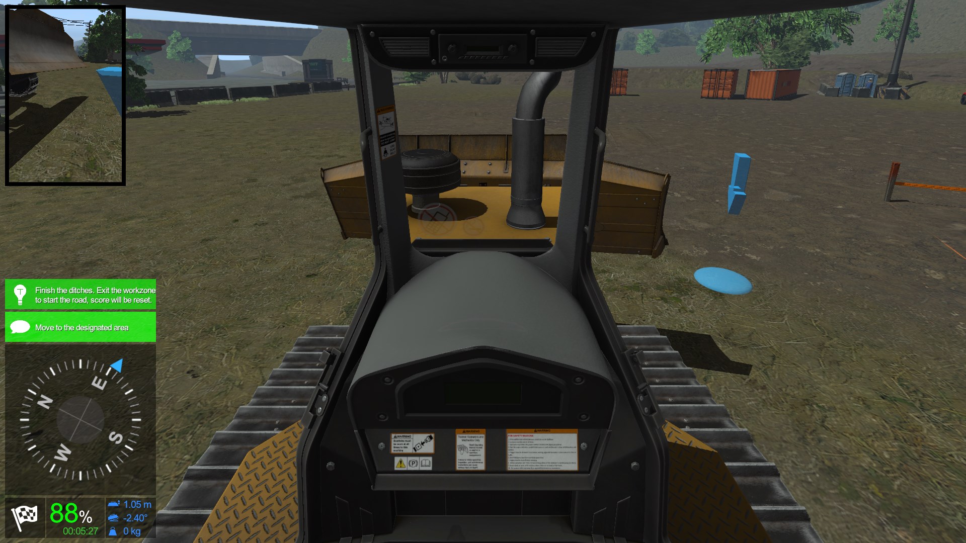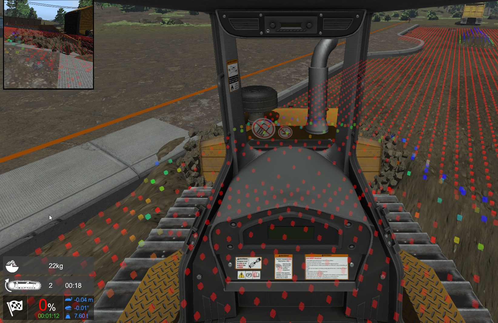 Otherwise, the module focuses on all the safety measures that are needed to operate this machine in a real environment. All basic operations are covered in different short exercises, from unloading the vehicle from a trailer to spreading material around manholes for road creation.